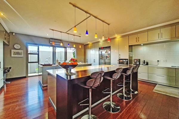 Adjacent to the reception rooms is a well-equipped kitchen with ample cupboards and storage. It features two islandsone for meal preparation and another with seating for casual dining.