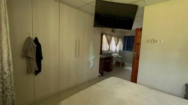 Enjoy peace of mind with a comprehensive security system, including CCTV and burglar bars. The property is totally fenced, featuring a brick wall and an electric gate, ensuring privacy and safety. The tiled floors, built-in cupboards, and curtain rails throughout the home add to its charm and functionality.