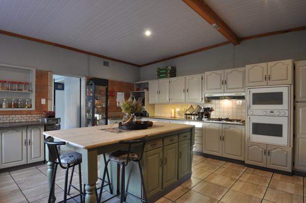 Contemporary chefs kitchen fitted with ample cabinetry, electric double oven, and gas hob.