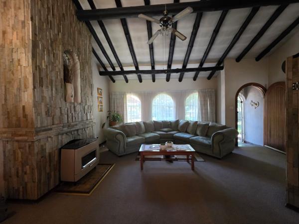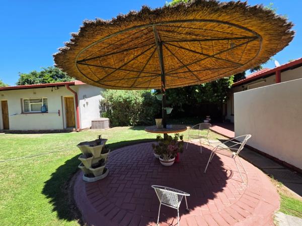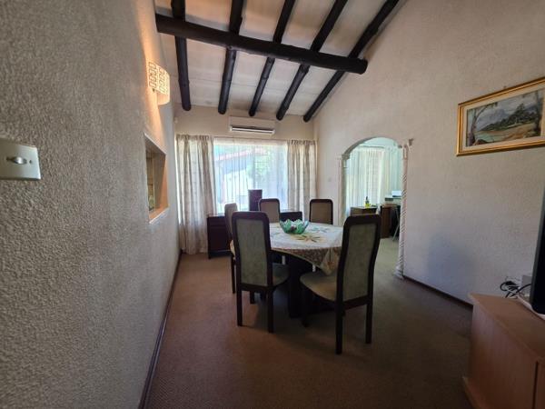 Outside, the property provides a private oasis. Enjoy leisurely days by the well-maintained swimming pool, surrounded by green lawns and mature trees. A dedicated lapa and a spacious patio with a thatched umbrella offer perfect settings for outdoor entertaining and relaxation. The property also benefits from a single garage and four additional open parking spaces, ensuring ample accommodation for vehicles. Pets are permitted, making this an ideal family home. For peace of mind, the property is fitted with an alarm system.