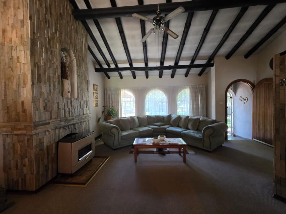 Step inside to discover a home rich in character, featuring high vaulted ceilings with exposed wooden beams that enhance the sense of space and light. The spacious lounge is a focal point, boasting a distinctive stone-clad feature wall with a fireplace and abundant natural light streaming through multiple arched windows. An adjacent dining room, also with vaulted ceilings and air conditioning, provides an ideal setting for family meals. The kitchen is equipped with ample light wood-tone cabinetry, a built-in oven, hob, and microwave, alongside space for a washing machine, all under a charming vaulted ceiling with exposed beams. A dedicated study offers a quiet workspace.