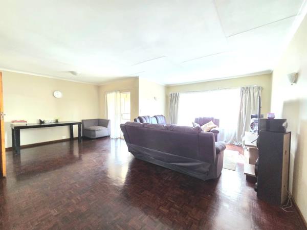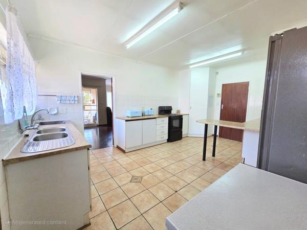 Step inside to discover a functional interior designed for comfortable living. The home includes a spacious lounge and a separate dining room, both featuring parquet flooring that adds a touch of classic charm. Natural light floods these areas through large windows and glass doors, creating bright and inviting spaces. The kitchen is generously sized, equipped with ample white cabinetry, tiled flooring, and a double stainless steel sink. It also features a breakfast bar, offering additional counter space and a casual dining option. While the kitchen finishes are functional, they present an opportunity for modern updates to suit personal taste. The property benefits from an open-plan special feature, enhancing the flow between living areas.