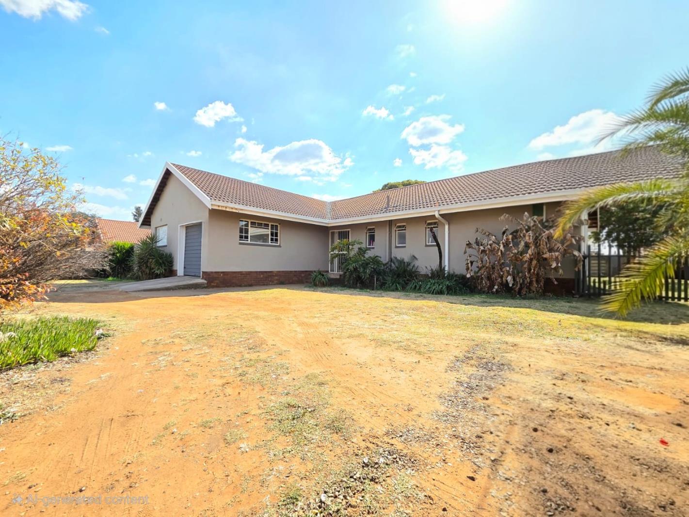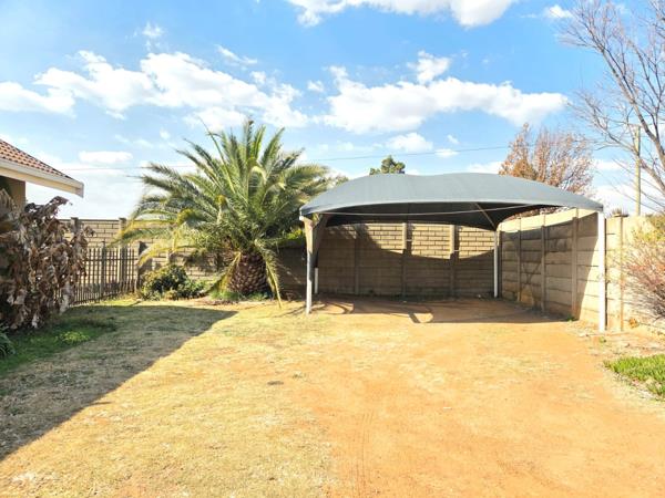 The single-story, L-shaped residence features a light-colored exterior and a durable tiled roof, presenting a classic suburban aesthetic. The property boasts a generous 972 sqm erf, offering ample outdoor space for various activities. While the front yard currently features an unpaved driveway and some unkempt landscaping, it holds significant potential for a buyer to create their ideal outdoor oasis. Security is enhanced with window bars and a covered patio with a security gate, providing peace of mind.