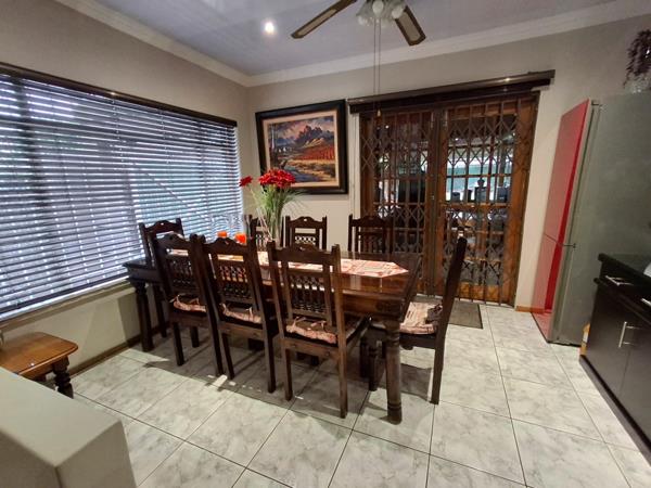 Step outside to discover a large, established garden and an exceptional covered outdoor entertainment area. This space, complete with a thatched roof, dark tiled flooring, and a built-in braai, is ideal for hosting gatherings year-round. Car enthusiasts and those needing extensive storage will appreciate the impressive six garages, complemented by two additional parking spaces.