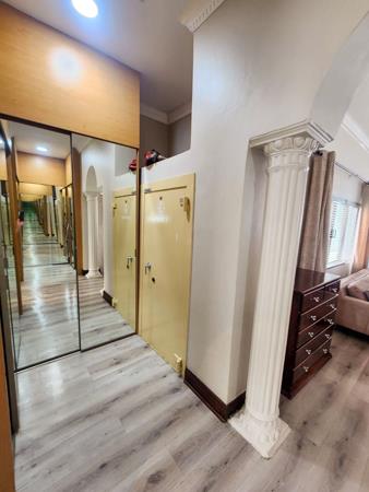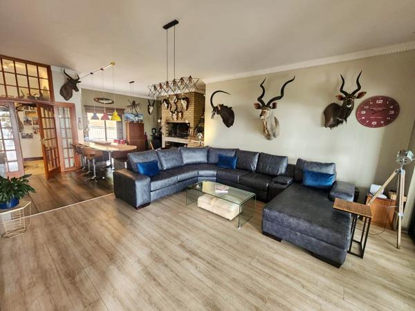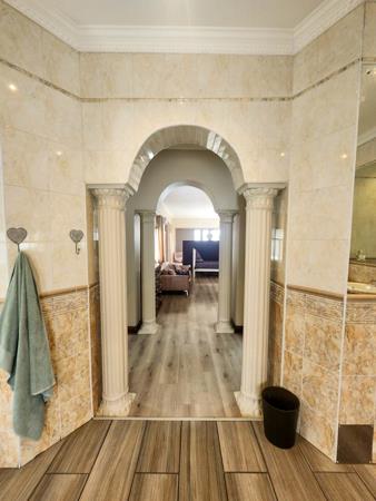 As you step inside, you are greeted by soaring ceilings and stately pillars that create an ambiance of grandeur. The expansive open-plan living and dining spaces flow harmoniously into an extraordinary entertainment area, expertly designed for hosting lavish gatherings. This versatile area features a well-appointed bar alongside a built-in braai and a traditional pizza oven, ensuring that every event is memorable and engaging.