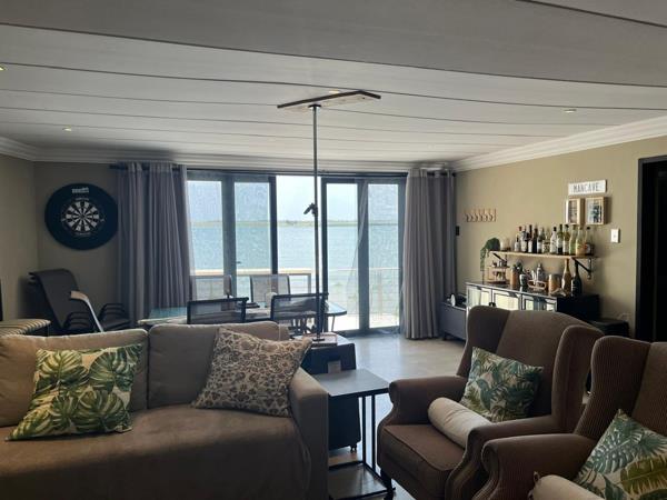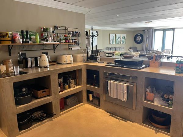 The home boasts huge glass stackable doors and windows offering breathtaking views of the water and horizon. The stackable doors opens up onto a braai patio for seamless indoor/outdoor living. The 3 bedrooms are thoughtfully designed. The master suite is a private retreat offering stunning water views with a modern en-suite bathroom. The 2 additional bedrooms are spacious and share a modern bathroom. Modern finishes including polished concrete floors, natural wood with sleek cemcrete countertops in the kitchen. Undercounter oven with glass hob and a breakfast counter complete this modern kitchen. Cozy open plan lounge and dining room creates a light-filled airy ambiance. Watch the sunset over the water while having drinks around the outdoor fire pit.