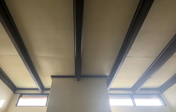 Exposed wooden beams throughout the house add a rustic yet contemporary charm, showcasing thoughtful design elements.