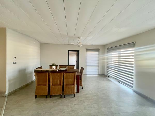 The home now offers modern finishes, own private entrance, fully walled with high perimeter wall. The one bedroom is currently used as a TV lounge as it offers two doors leading onto the patio. Two of the other bedrooms also leads onto separate patios. Another bedroom is on ground floor level with an en-suite bathroom and sliding doors to the outside patio leading to the swimming pool. Perfect lock-up-and-go, family home. Space for small dogs.