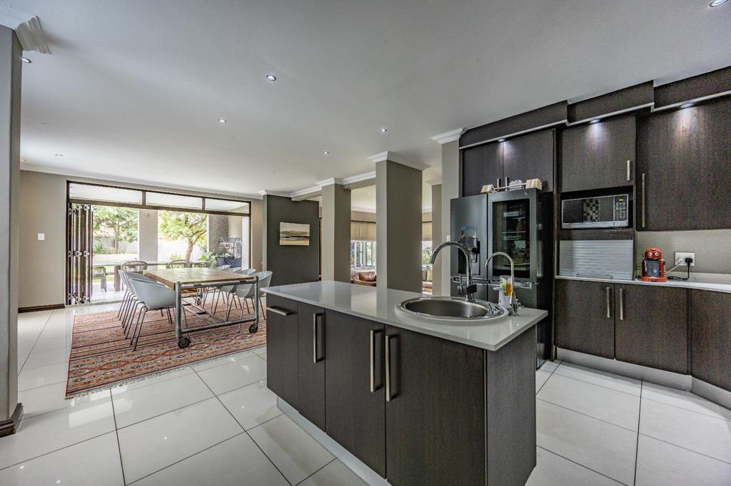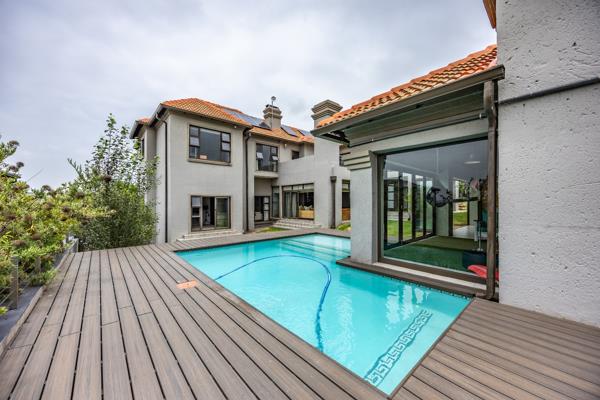 The heart of the home is the open-plan kitchen and dining area, complemented by a striking built-in bookshelf. The kitchen offers a walk-in pantry and separate scullery, flowing effortlessly to the double garages, which provide direct access into the scullery and outside. Outdoors youll find domestic quarters with a bathroom, a laundry positioned between the room and bathroom, and an additional storeroom. The covered patio with quality tiling leads onto a landscaped garden with irrigation, while the entertainment area with built-in braai opens onto the pool and wooden deck, making it perfect for hosting.