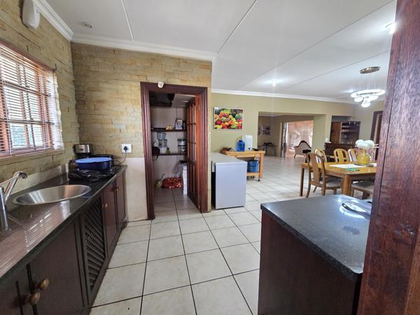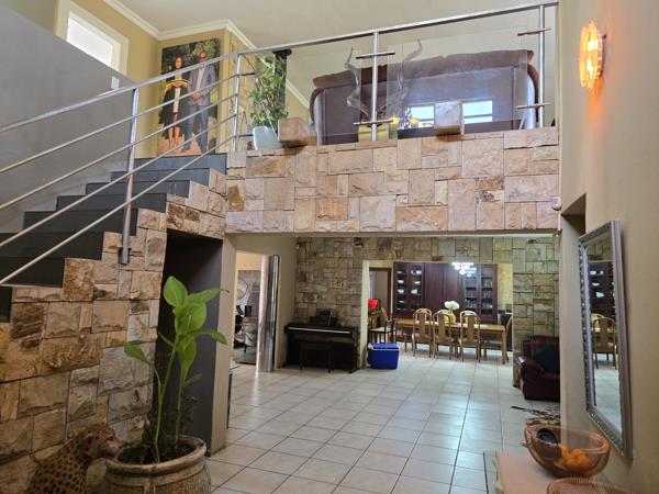 Connected to the main residence by a covered bridge is an additional building offering even more versatility. On the ground floor, this section features a flatlet with its own lounge, bedroom, bathroom, and patio, as well as a dedicated entertainment area complete with a bar. Upstairs, theres an office with a balcony overlooking the manicured garden, along with an additional bedroom and bathroom. Outdoors, the property is a true retreat with a sprawling landscaped garden, lapa, boma, water feature, and ample space for gatherings or quiet relaxation. This home provides a unique lifestyle opportunity with its combination of luxury, functionality, and entertainment amenities, making it a rare find.