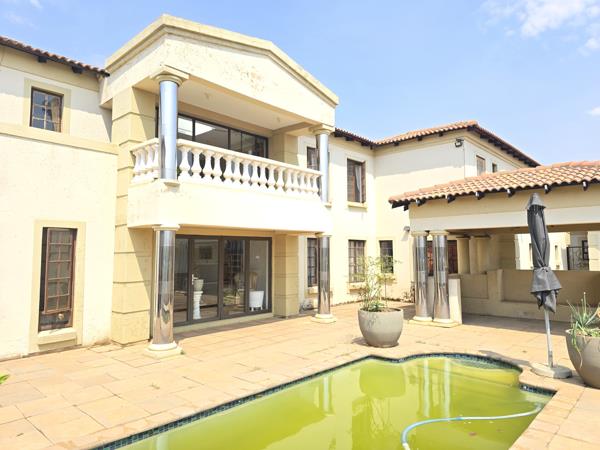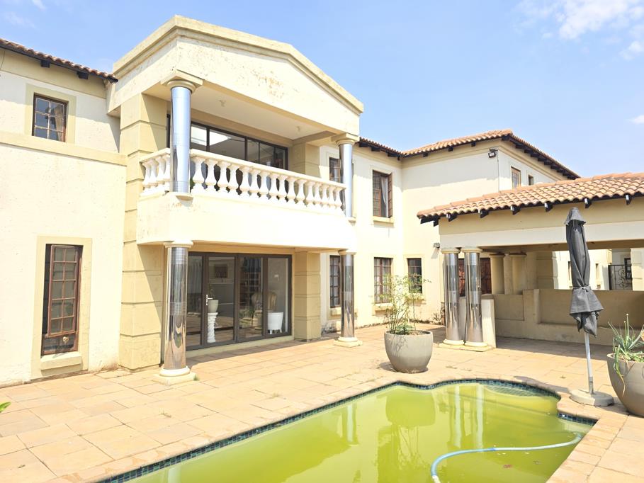This remarkable property offers elegance, comfort, and versatility, making it ideal for both family living and entertaining on a grand scale. The main house welcomes you with a double volume entrance hall, leading into expansive living areas that include two guest bedrooms one with an en-suite, a guest toilet, a modern kitchen with pantry and scullery, a dining room, lounge, TV room, and an executive lounge fitted with a gas heater. One of the lounges opens directly onto the swimming pool area, creating a seamless indoor-outdoor flow. Five garages provide ample secure parking for a large household. Upstairs, youll find a lounge, a full bathroom, and five bedrooms, all with balcony access. The master suite features a spacious wardrobe closet and a luxurious en-suite bathroom, while one of the bedrooms opens into a sunroom with stunning views of the pool and entertainment area.