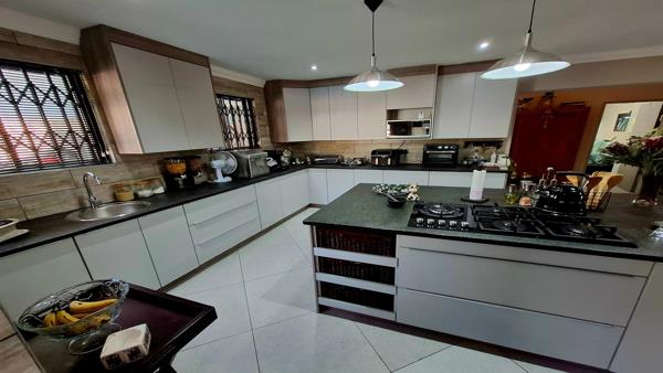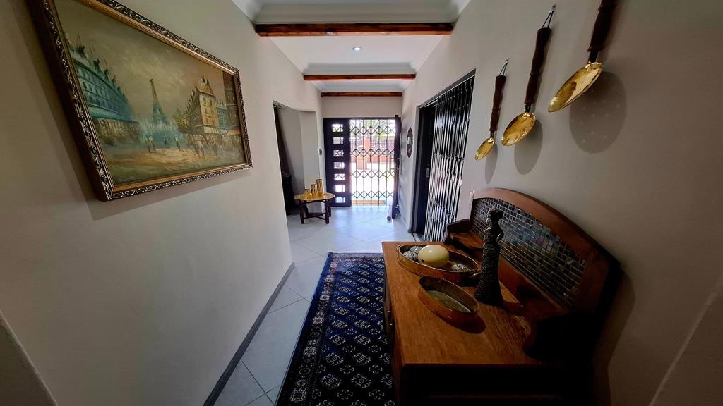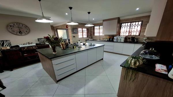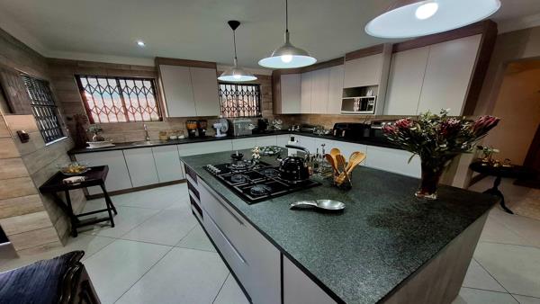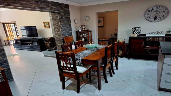 The property brags with the Lounge that also have a built-in fireplace. The Dining room offers space for a 10-seater table and is set in an open plan with the Kitchen. The Kitchen is a designers paradise with Rhodesian Stone counter tops, lots of built-in cupboards, a kitchen island with gas hob, and a separate scullery and washing area leading to the back yard.