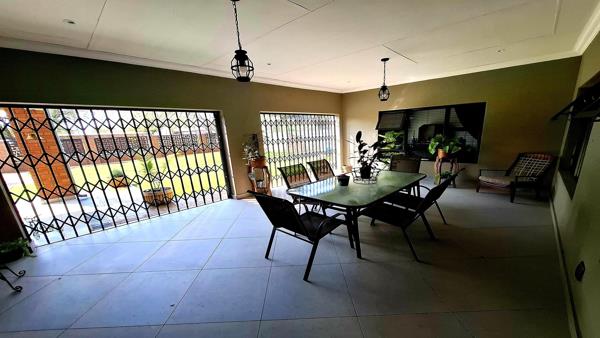The property opens into the entrance Hall, leading to a covered patio on your left-hand side that is enclosed with Trellis. On the right-hand side, it is leading to the Massive entertainment arearoom with built-in fire place, braai and bar with glass sliding doors to the swimming pool and under cover patio in the back garden. This entertainment room also offers a guest toilet and guest Bedroom, which is 1 of 4 bedrooms.