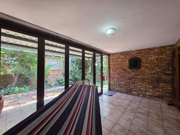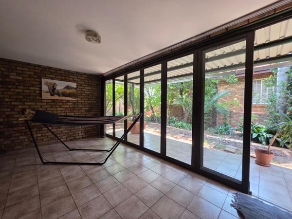 Enclosed patio with aluminium stacker doors overlooking the garden