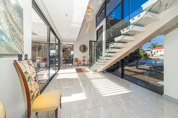 Inside, the home unfolds into multiple light-filled living areas including two elegant lounges, a statement fireplace, formal dining room, built-in bar, private gym, and executive study. The designer kitchen is both sophisticated and functional, complemented by a separate pantry, scullery, and laundry. Upstairs, four luxurious en-suite bedrooms offer refined comfort, each with bespoke cabinetry and serene estate views, while the master suite delivers a true sanctuary experience. Additional features include staff accommodation, four garages, air conditioning throughout, and a powerful solar system with a 16kVA inverter - ensuring energy efficiency without compromise. A rare opportunity to secure a turnkey luxury home in one of South Africa''s most sought-after golf estates.