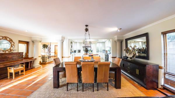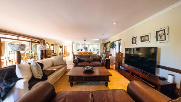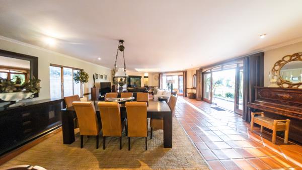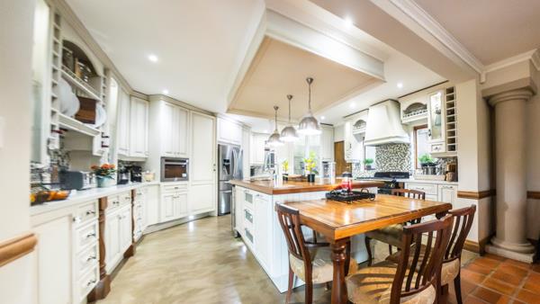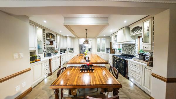 From the front door as you enter the home on the right is a guest toilet conveniently located close to the living areas. The passage then leads in two directions, guiding you through a thoughtfully designed floor plan. To one side, youll discover a gourmet open-plan kitchen that flows effortlessly into a spacious dining area and family room. The magnificent kitchen features ample soft-close cabinetry, a large centre island with a prep bowl, and a premium Falcon stove equipped with a gas hob, griller, and electric ovens. A separate scullery and laundry area are discreetly tucked away for added convenience. A wood-burning fireplace anchors the living space, perfect for cozy evenings during the cold Winters.