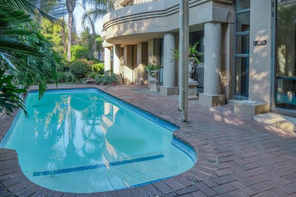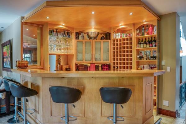 Connected to both the lounge and built in bar is the dining area, positioned for effortless hosting. Opposite this space, glass doors open to a covered patio with a built-in braaiperfect for sunny afternoons and evening gatherings. Just beyond the patio, a small staircase leads you down to an inviting swimming pool framed by lush greenery. Its a peaceful, private escape nestled right beside the house, with access to a large entertainment room with a gas braai, which also connects to the patio