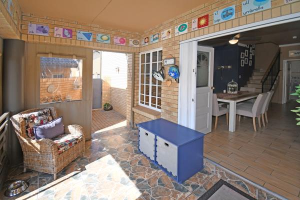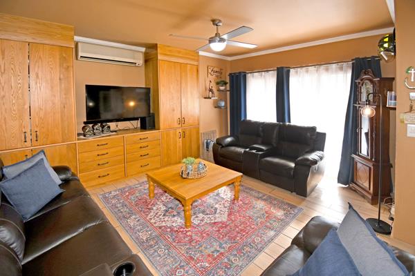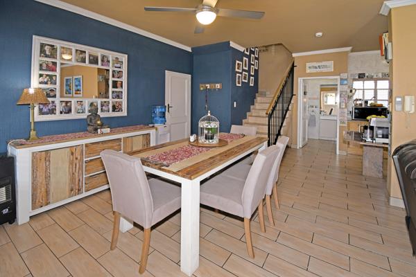 Ground floor welcomes you to open plan kitchen with a scullery, air-conditioned lounge with fitted TV cabinet, and dining room opens with double doors onto private stoep and super low maintenance garden. The guest cloakroom is tucked under the staircase.