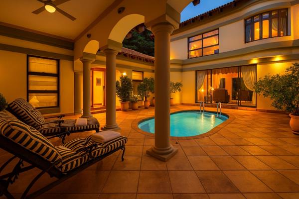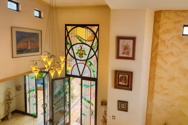 Positioned directly on the 18th fairway, this elegant family residence enjoys serene views over the fairway and lake from the upper level. Mature trees and beautifully landscaped gardens create a tranquil, private atmosphere, further enhanced by a charming pond and an inviting entertainment stoepbraai area overlooking the green.