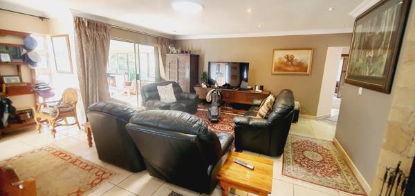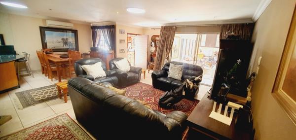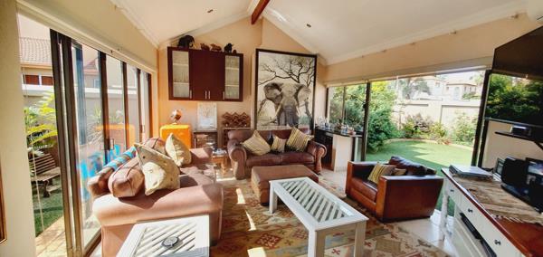 Spacious enclosed patio with built-in braai, aluminium door frames open to the lovely, low-maintenance garden