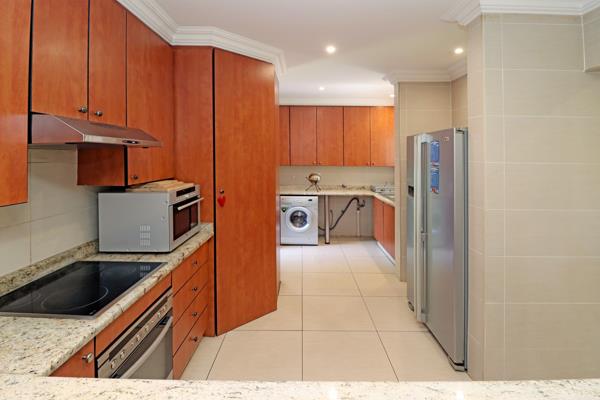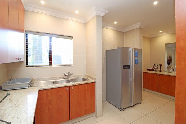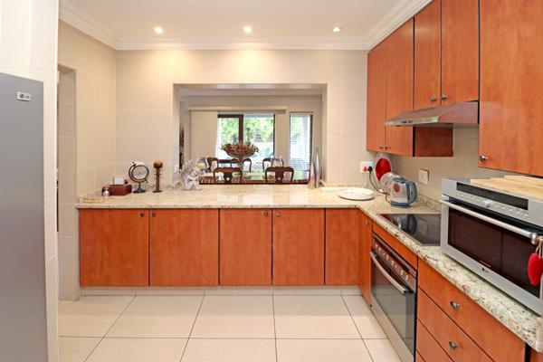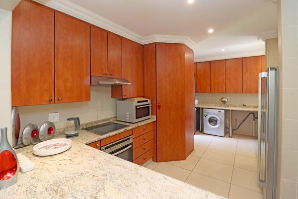 The light and bright interior, open-plan living areas features a spacious family kitchen with a breakfast bar, tasteful light shaded counter tops, ample cupboard space including a pantry cupboard, and a separate scullery. The scullery opens with a back door to the manicured garden.