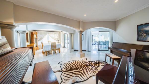 The first living area, currently used as a music room, is part of the home''s open-plan layout. Opposite it is a spacious dining room. Further down the passage there is an open-plan kitchen, featuring ample built-in storage cupboards, breakfast nook, and a gas/electric stove with a double oven. A separate scullery/laundry is neatly tucked away. Adjacent to the kitchen there is a warm and inviting family/TV room. From here sliding doors lead you to a large, enclosed patio, the ultimate indoor-outdoor living space. It includes a built-in braai, 3 sets of stacking doors that open to the outside, with easy access to the Jacuzzi, swimming pool, and immaculate garden with Mango, Peach, and Lemon trees (back garden).