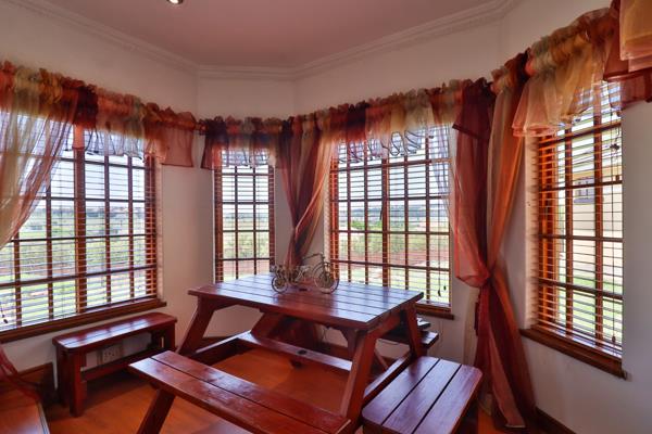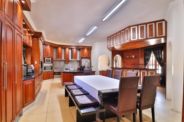 The house has a large kitchen with sufficient storage, breakfast nook and seating for smaller kids next to bay windows. The kitchen tops is fitted with Caesar stone. The Italian Fratelli stove is a combination of gas and electric together with a extractor fan. There is also electric oven with extractor fan. The current owners fitted a Jet master gas braai in the kitchen. Close to the kitchen is the entrance to the six garages (tandem).