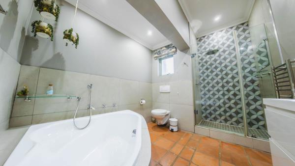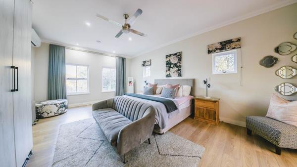 On another level of the house are 4 sizable bedrooms with ample cupboard space. One of the bedrooms has its own en-suite full bathroom. All the bedrooms have access to the garden area. There is also a large gym area with a built-in sauna and beautiful views over the garden. This room can also be utilised as a big playroom, studio room or alternatively a large open-plan, bachelors pad. The master bedrooms with a cozy fireplace and a private patio, is nestled in a private wing, with doors leading to the garden. This bedroom is away from the other bedrooms, with a large walk-in closet and a his and hers bathroom. The ladys bathroom has an outdoor atrium, basin, toilet, shower, and bath. His bathroom consists of a in and outdoor shower and double basin.