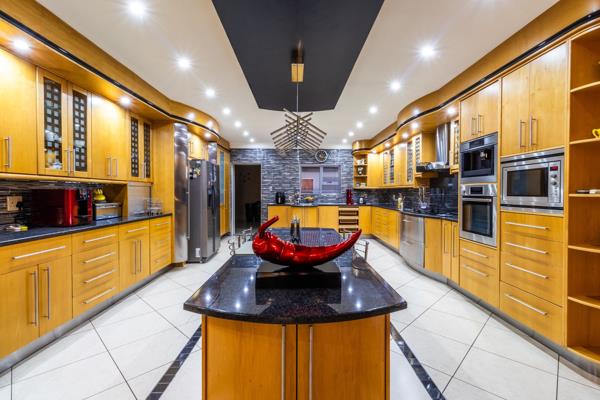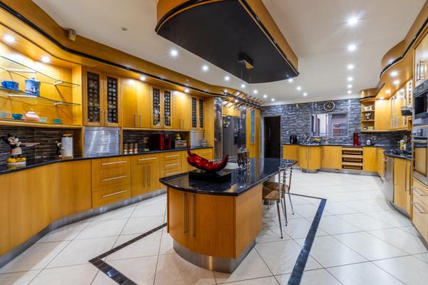 As you enter the home, you are greeted by a lavish double-volume entrance hall that sets the tone for the rest of the residence. The gourmet kitchen, a chefs dream, features solid yellowwood cabinetry and sleek black granite countertops, providing an ideal space for culinary creations. Adjacent to the kitchen, the entertainment areas are equally impressive, including three expansive lounges designed for both intimate gatherings and grand events. A solid wood bar and a dedicated braai room add a touch of sophistication and are perfect for hosting guests.