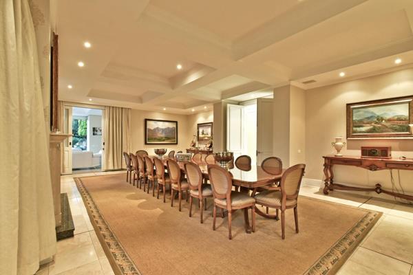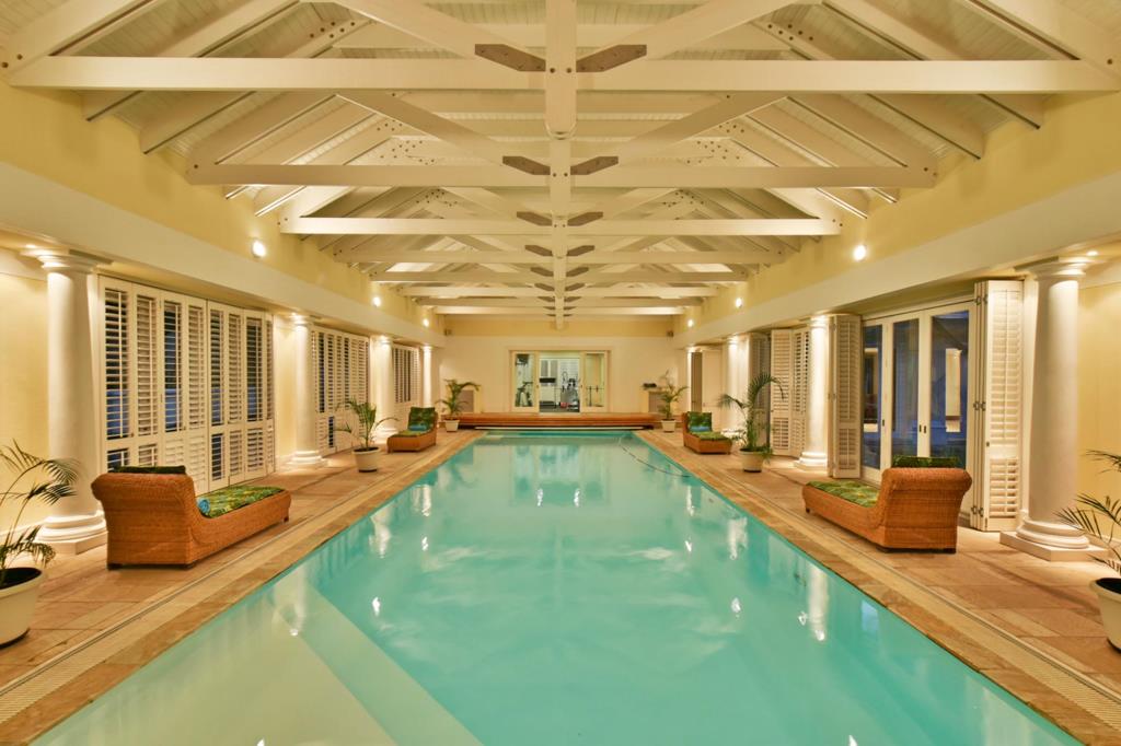 The main entertainment area of the home is situated within the Orangerie. The climate-controlled lap-pool is flanked on either side by vast entrainment areas, offering a built-in braai, bar and dining area on the one side and a bar, billiards and games room on the other. There is a home-gym, with steam-