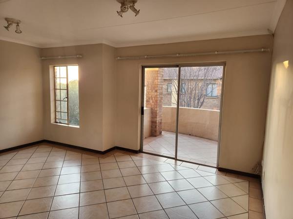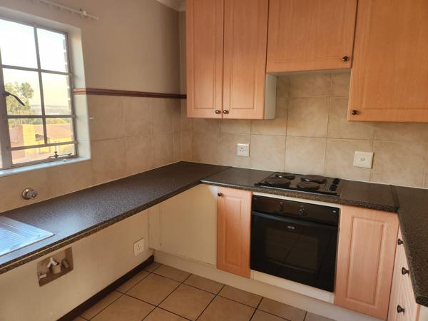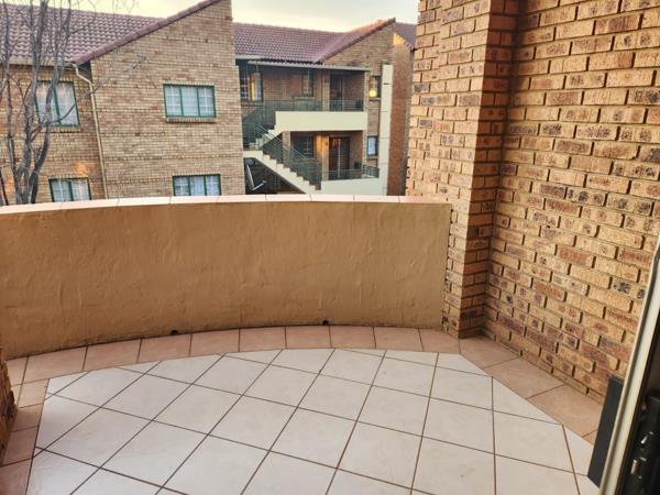 Top floor apartment available in the popular Parklands complex in Die Hoewes, Centurion. The unit has 2 bedrooms, 1 full bathroom, and an open plan kitchen leading into the living area. Sliding doors lead onto a large balcony with an amazing view of Centurion.