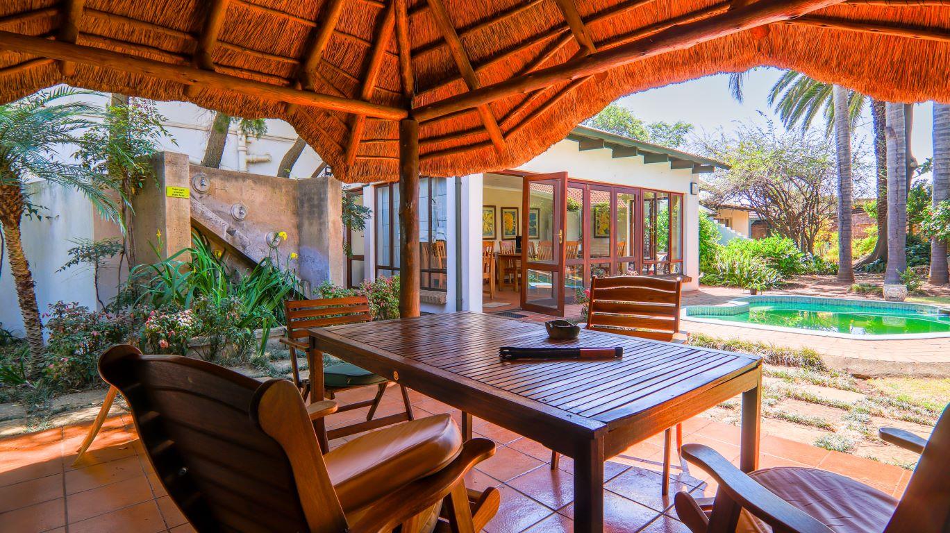 Dining room leading to a sunroombreakfast patio with access to the pool area featuring a Lapa and built-in braai.