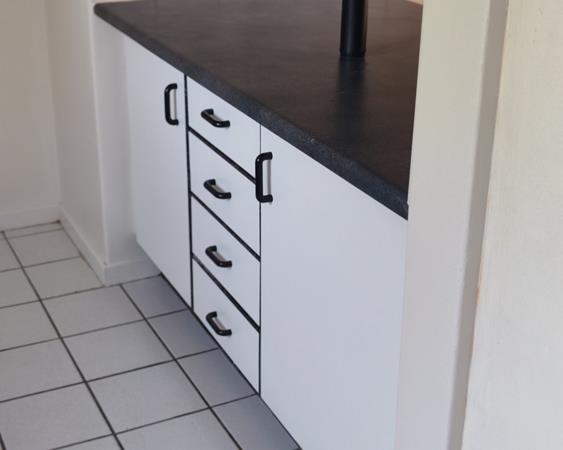 The kitchen has lovely cupboards and enough space for you electrical appliances.