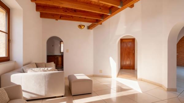 Inside, the home features a spacious open-plan lounge and dining area, bathed in natural light from large windows. The clean white tiled flooring throughout creates a bright atmosphere, further enhanced by an eye-catching exposed brick accent wall and architectural archways. A ceiling fan ensures comfort in the living space.