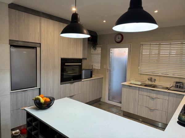 Step into a light-filled open plan lounge and dining area, opening through double doors onto a sunny covered patio with a louvre roof and a built-in braaiperfect for relaxing or entertaining.