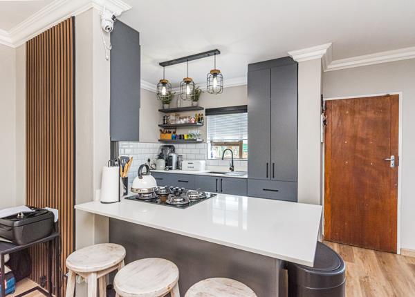 Upon entry, you are welcomed into a spacious open-plan lounge, dining, and kitchen area. These modern living spaces are fitted with ceiling fans, stylish laminate flooring, aluminium windows with fitted blinds, and attractive ambient kitchen lighting that enhances the contemporary feel. The well-designed kitchen boasts modern cabinetry, a breakfast nook, quartz countertops, a gas hob, and space for a dishwasher, while the laundry area is conveniently located elsewhere.