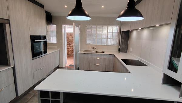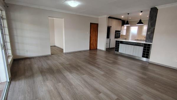 The home welcomes you with a light-filled open-plan lounge and dining area, flowing seamlessly through double doors onto a sunny covered patio featuring a louvre roof and built-in braaiideal for entertaining or enjoying quiet afternoons.