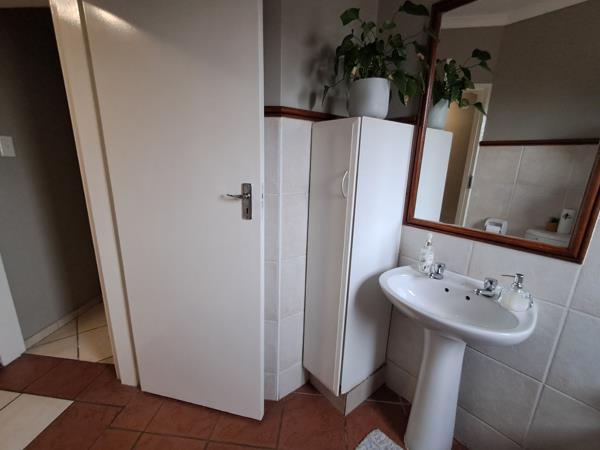 The residence includes three comfortable bedrooms, each finished with neutral walls and tiled flooring. Built-in wardrobes offer practical storage solutions, contributing to an organised living environment. There are two functional bathrooms, one featuring a bathtub, pedestal sink, and toilet, all with tiled surrounds for easy maintenance.