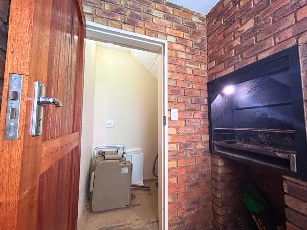 Covered patio with built in braai and service counter overlooking a neat, private garden