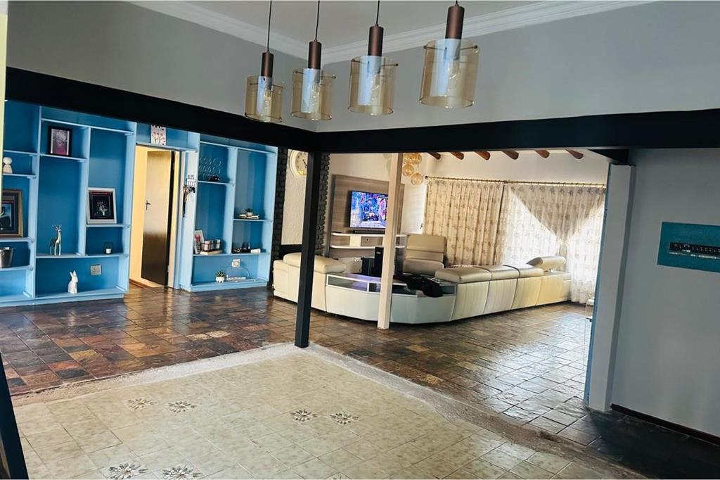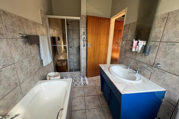 The home boasts five 5 spacious bedrooms, all with tiled flooring and built-in cupboards. The main bedroom is a standout, featuring built-in cupboards, air conditioning, its own geyser, and a luxurious en-suite bathroom complete with double basins, a bathtub, shower, and toilet all finished with sleek tiling. The remaining four bedrooms share two additional full bathrooms, both tiled and equipped with a bathtub, basin, and toilet. A built-in linen cupboard adds convenient storage to the central hallway.