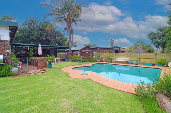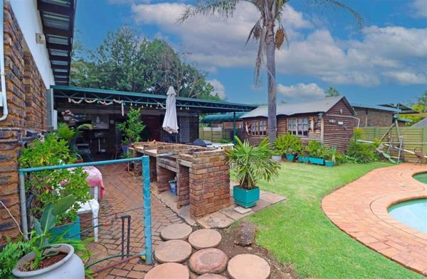 Outdoors, the property truly shines with a landscaped garden, swimming pool, and dedicated braai area, perfect for entertaining. Additional features include two Wendy houses, paved areas, and ample storage.