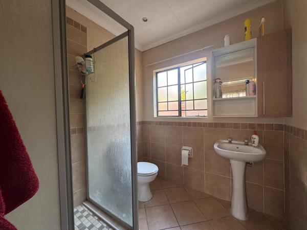Accommodation consists of three well-sized bedrooms, all tiled and fitted with built-in wardrobes. The main bedroom benefits from a private en-suite bathroom, while the second bathroom serves the remaining bedrooms. Both bathrooms are neatly finished with tiled surfaces and modern shower cubicles.