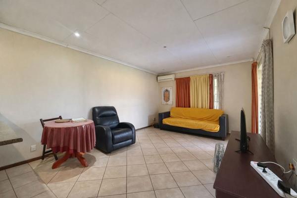 Measuring approximately 125 sqm, the home opens into a bright and airy open-plan living area. The lounge and dining spaces are finished with tiled flooring, recessed lighting, and large sliding doors that allow for a seamless transition between indoor and outdoor living. An air-conditioning unit ensures comfort throughout the year.