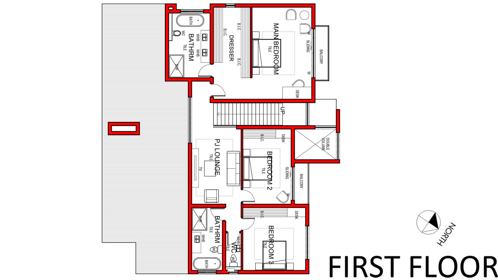 A striking double-volume staircase leads to the first-floor family area. At the landing, the main bedroom is positioned to the right and features a walk-in closet, full en-suite bathroom, and private balcony.