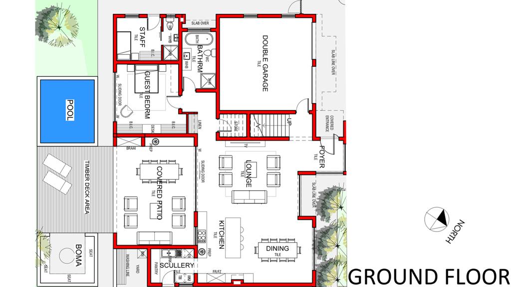 Premium outdoor entertainment area with covered patio, built-in braai, timber deck, pool, and BOMA with firepit and built-in seating