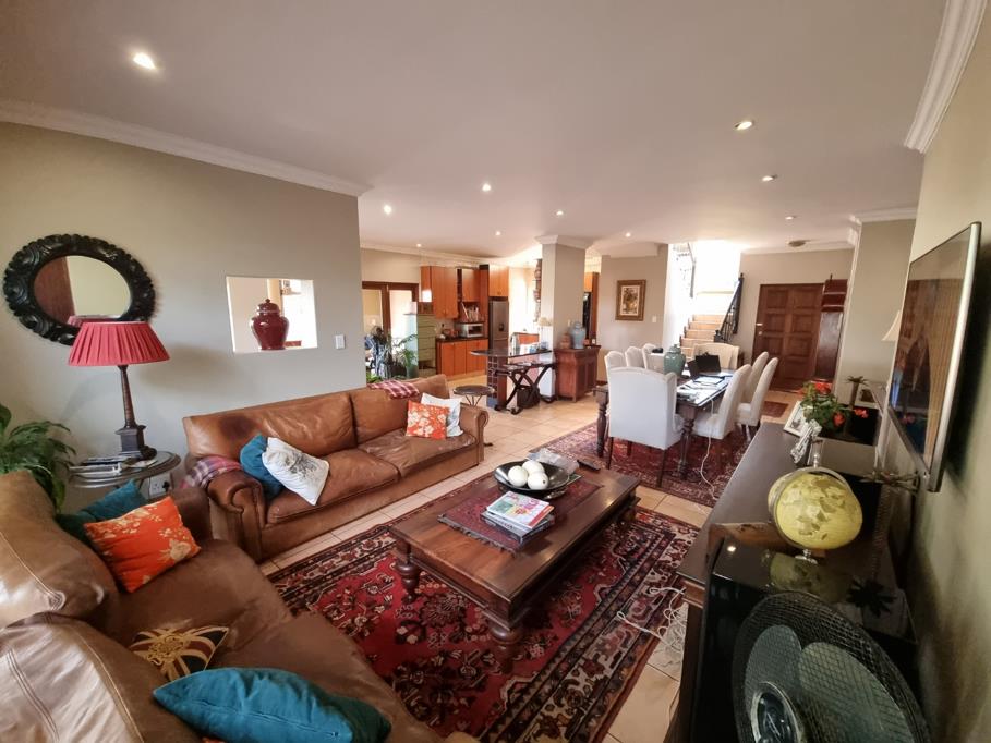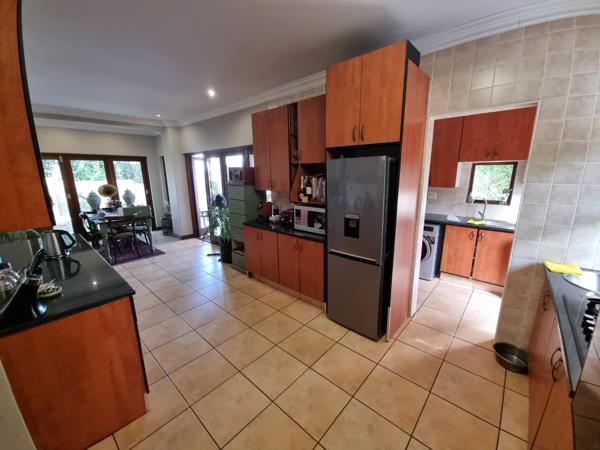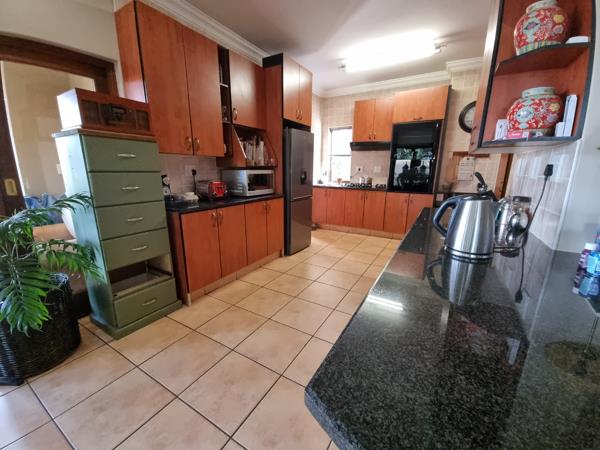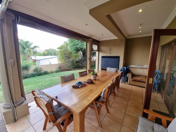 The home offers five comfortable bedrooms and four bathrooms, including one en-suite, ensuring privacy and comfort for all residents. A dedicated study provides an ideal space for work or quiet contemplation, while a familyTV room offers an additional versatile living area. A balcony extends the living space, offering scenic views. Outdoor living is a highlight, with a spacious covered patio perfect for al fresco dining and relaxation. This area features an integrated braai, ideal for entertaining guests, overlooking a lush, mature garden with a well maintained lawn. The property also includes three garages and additional paved driveways, providing secure parking for multiple vehicles. Pets are allowed, making it a perfect family home.