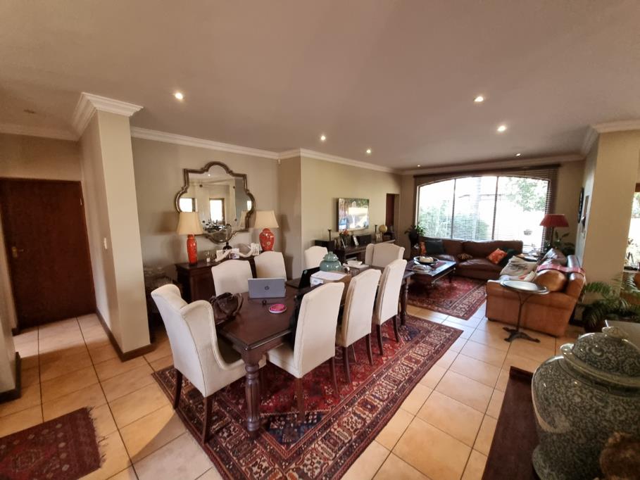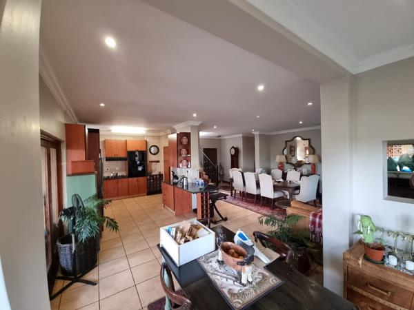 Discover this spacious 5 bedroom, 4 bathroom residence nestled within the secure Irene View Estate in Centurion, South Africa. Boasting an attractive Mediterranean-style architecture, this home offers a generous 302m2 under roof on a 585m2 erf, providing ample space for family living and entertaining. The property features a welcoming kerb appeal with its established garden and inviting facade. Step inside to an open plan layout that seamlessly connects the living, dining, and kitchen areas, all adorned with durable tiled flooring and elegant crown molding. The kitchen is well appointed with wood toned cabinetry, dark countertops, a modern stainless steel refrigerator, and includes a dedicated scullery and pantry for added convenience. Large glass doors in the dining area provide abundant natural light and direct access to the outdoors.