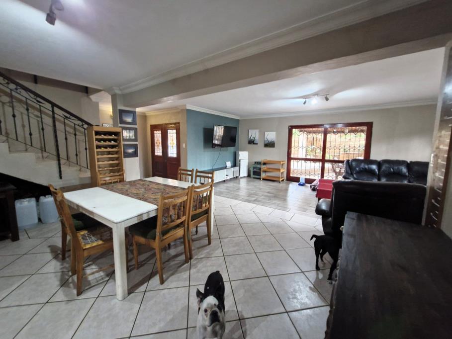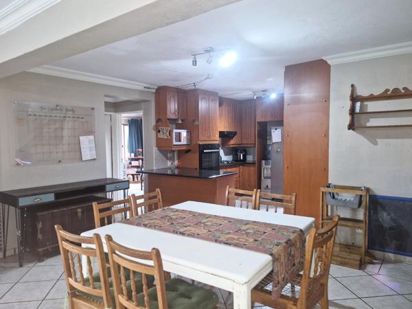 The open-plan dining area flows into a well-appointed kitchen that offers plenty of cupboard space and a separate scullery for added convenience.