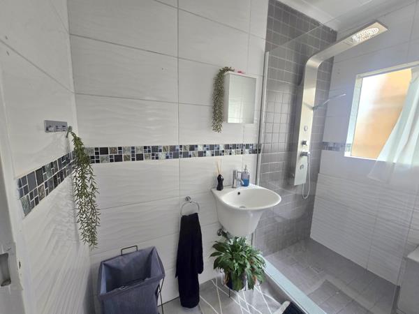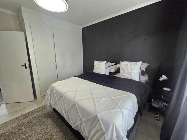 The home features 2 bedrooms, 1 neat bathroom with a shower, and a modern kitchen fitted with new built-in cupboards and a gas stove. The main bedroom and lounge are both fitted with stylish modern ceiling fans for added comfort.