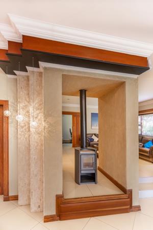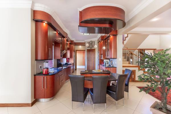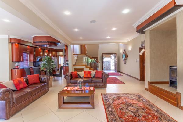 Superior Realty is proud to present this truly rare property that combines privacy, low maintenance, perfect positioning and open plan living. Driving up to the home, you are greeted with 4, extra sized garages - 8x7 m. Open the front door to reveal substantial open plan living areas which include, living room with fire place, large dining room, TV room, open plan kitchen and patio. The kitchen cabinetry is handcrafted solid cherry wood with stargazer granite tops, the stove is both gas and induction. The patio overlooks a gorgeous park inside the estate whilst still providing privacy. There is a sound system in the living area, positioned in the roof that you can control via your smartphone. Downstairs is a spectacular temperature controlled wine cellar, and a study overlooking the park. Moving upstairs the home features a sizeable pyjama lounge, main bedroom with stunning solid wood cabinetry, full en suite bathroom with double vanities. Three more bedrooms, 2 with en suite bathrooms, 4th & 5th bedroom''s bathroom is adjacent to the bedrooms. You can access the upstairs of the house through a separate entrance from the outside. The property is an engineering marvel with high density insulation to control temperature in the home, solar geyser, double glazing in the main bedroom that cancels out any sound from outside. The Home also features servants quarters and extra storage in the roof of the garage.